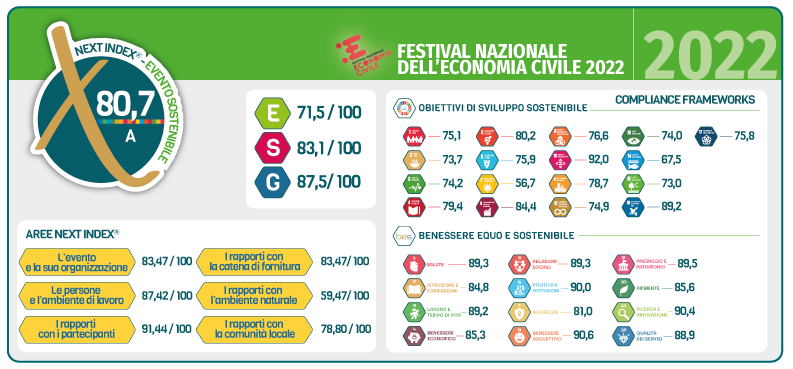 È stata anche avviata la prima valutazione d’impatto del Festival per analizzare i benefici sociali e ambientali che sono stati generati in questa edizione connessi con i 17 obiettivi dell’Agenda 2030 e con i 12 domini del BES. Dalla scelta di fornitori sostenibili, al rispetto e all’equa remunerazione di tutti i lavoratori/trici coinvolti fino ad arrivare ai materiali ecocompatibili utilizzati per la manifestazione, con un riconoscimento importante del MITE come evento plastc free, fino al coinvolgimento delle comunità locali per condividere i percorsi di formazione e promozione sull’economia civile prima del Festival. Infatti, sono state coinvolte: